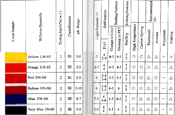 1、適合超細(xì)纖維織物的中深色染色,黃紅藍(lán)可作為驗色調(diào)三原色,橙、紅玉、深藍(lán)可作為暗色調(diào)三原色。